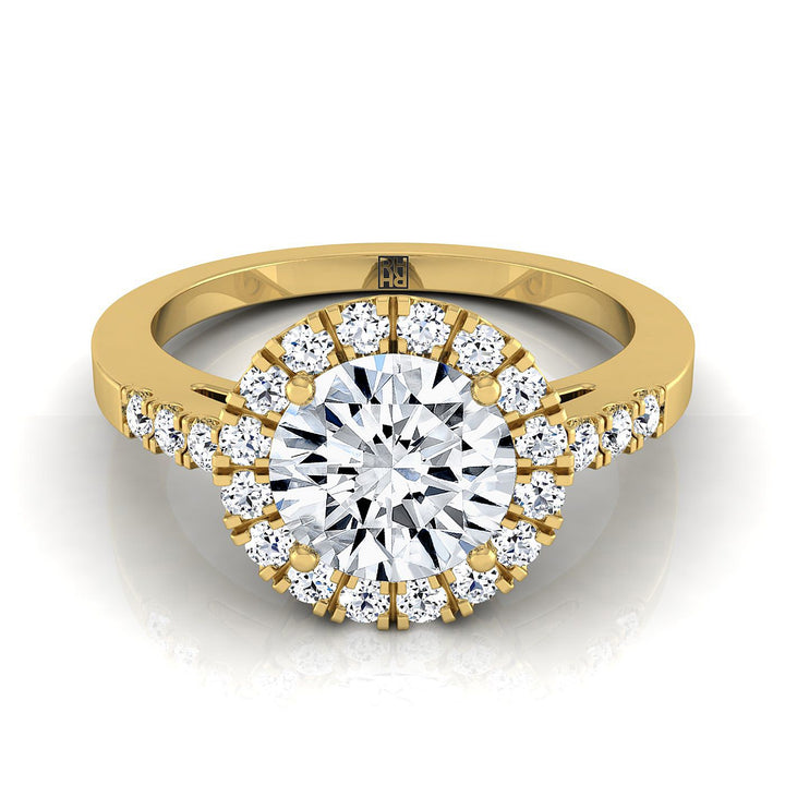 Classic And Elegant, This Brilliant Cut Diamond Halo Engagement Ring With A Pave Shank Showcases Brilliant Cut Diamonds (h-i/vs 0.33ctw) Beautifully Set In A Classic 18k Yellow Gold Setting.