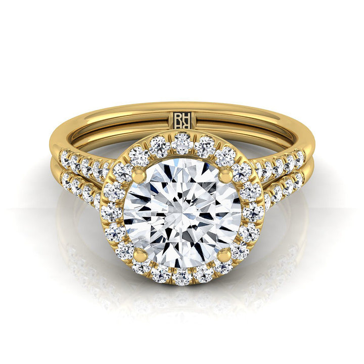 14K Yellow Gold Round Brilliant French Pave Split Shank Halo Engagement Ring -3/8ctw