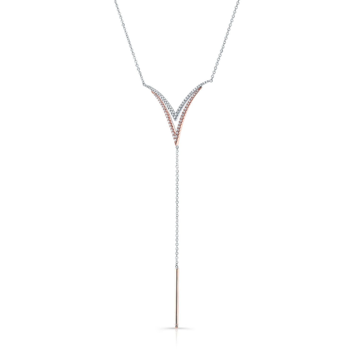 Diamond Pave Double-v And Solid Bar Y-necklace In 14k Rose And White Gold (16-18 In Adj Chn)