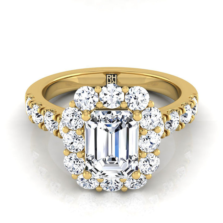 18K Yellow Gold Emerald Cut Diamond Luxe Style French Pave Halo Engagement Ring -1-1/10ctw