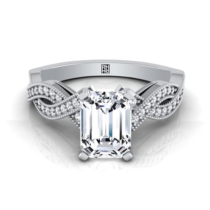 Charming Emerald-cut Engagement Ring With Pave Infinity-style Millgrained Shank Showcasing Round Brilliant Diamonds (h-i/vs 0.20ctw) Beautifully Set In 14k White Gold