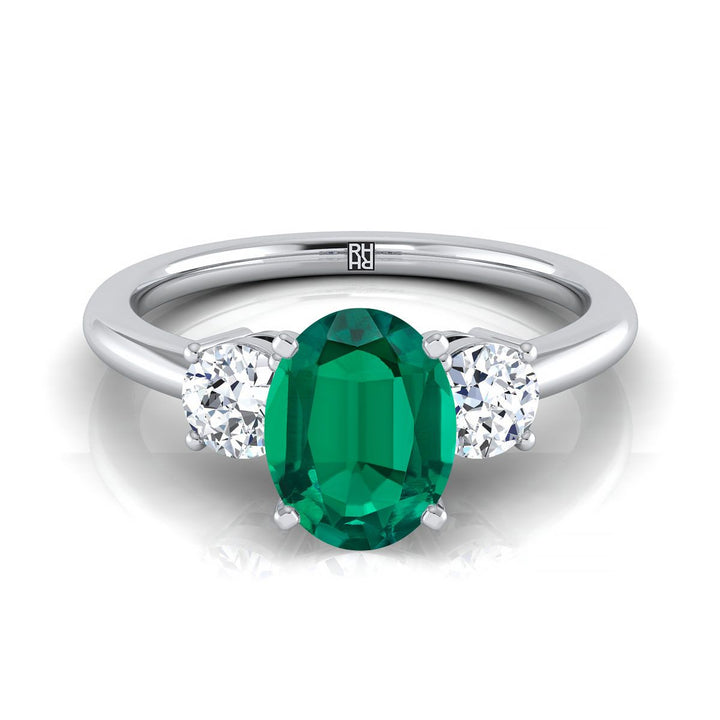 18K White Gold Oval Emerald Perfectly Matched Round Three Stone Diamond Engagement Ring -1/4ctw