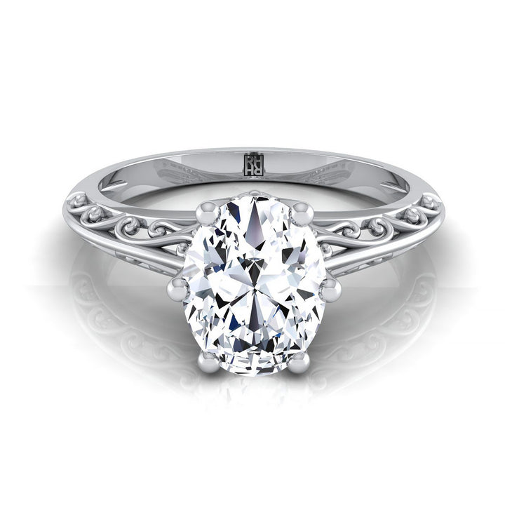Platinum Oval Delicate Vintage Scroll Cut Out Solitaire Engagement Ring