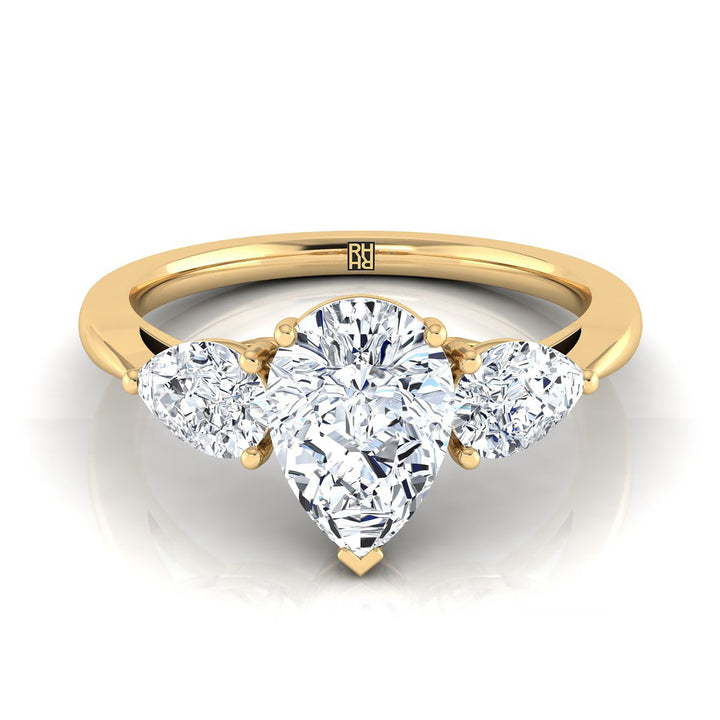 18K Yellow Gold Pear Shape Center Diamond Perfectly Matched Pear Shaped Three Diamond Engagement Ring -7/8ctw