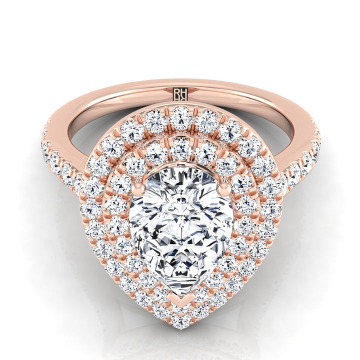 14K Rose Gold Pear Shape Center Double Pave Halo with Linear Diamond Engagement Ring -7/8ctw