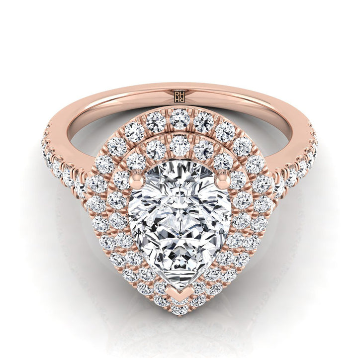 14K Rose Gold Pear Shape Center Diamond Double Halo Scalloped Pavé Engagement Ring -1/2ctw