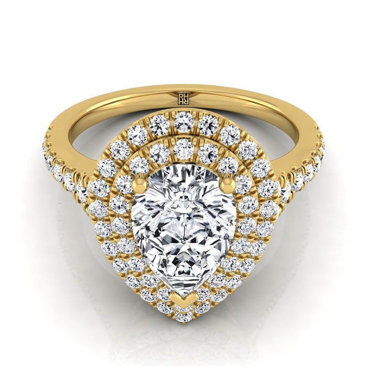 An Elegant Statement Of Style, This Double Halo Pear Shape Pave Engagement Ring Showcases Brilliant Cut Diamonds (h-i/vs 0.55ctw) With An Exquisite Pave Shank Mounted In A 18k Yellow Gold Setting.