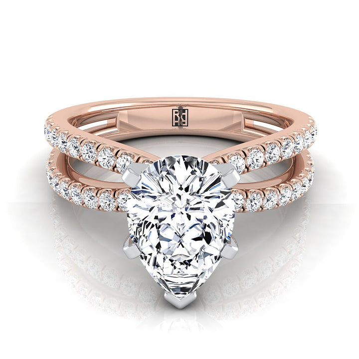 14K Rose Gold Pear Shape Center Diamond Two Row Pavé Split Shank Engagement Ring -1/3ctw