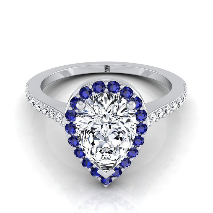 Platinum Pear Shape Center Classic French Pave Blue Sapphire Halo and Linear Engagement Ring -1/6ctw