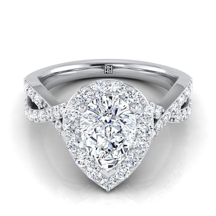 A Modern Statement Of Style, This Pear Shape Halo Pave Engagement Ring With Infinity Shank Showcases Brilliant Cut Diamonds (h-i/vs 0.75ctw) Mounted In A 14k White Gold Setting.