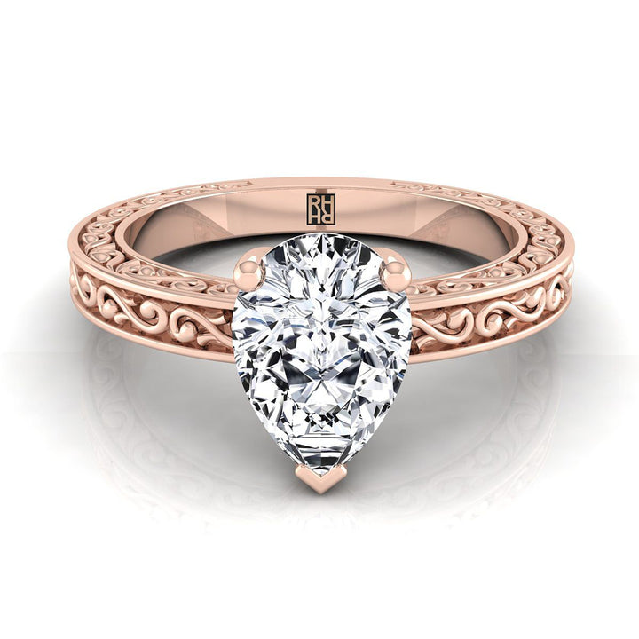 14K Rose Gold Pear Shape Center Hand Engraved Scroll Vintage Solitaire Engagement Ring
