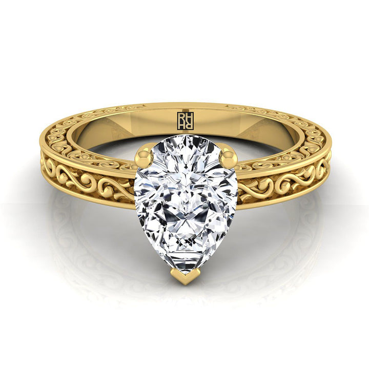 14K Yellow Gold Pear Shape Center Hand Engraved Scroll Vintage Solitaire Engagement Ring