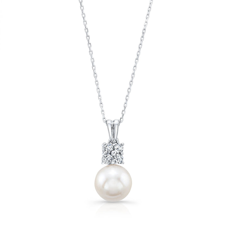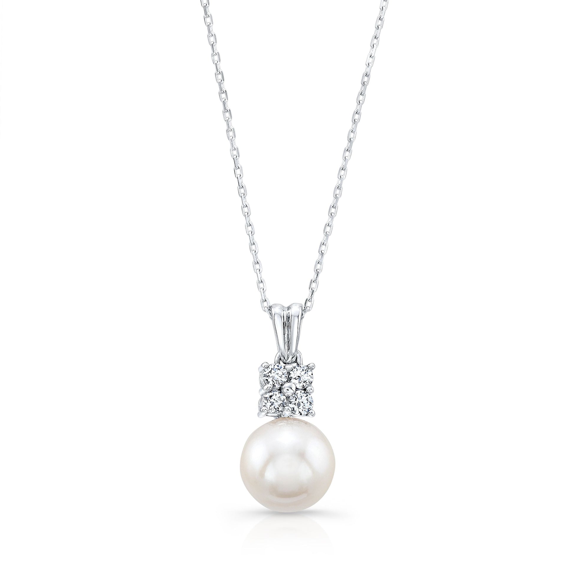 14k White Gold Pendant With 1 Round Half Cut Cultured Pearl At 8.0-8.5mm, 4 Round Brilliant Diamonds Weighing 0.15ctw, 17-in D/c Curb