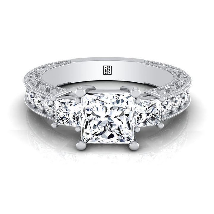14K White Gold Princess Cut Diamond Hand Engraved Three Stone Vintage Channel Engagement Ring -3/4ctw