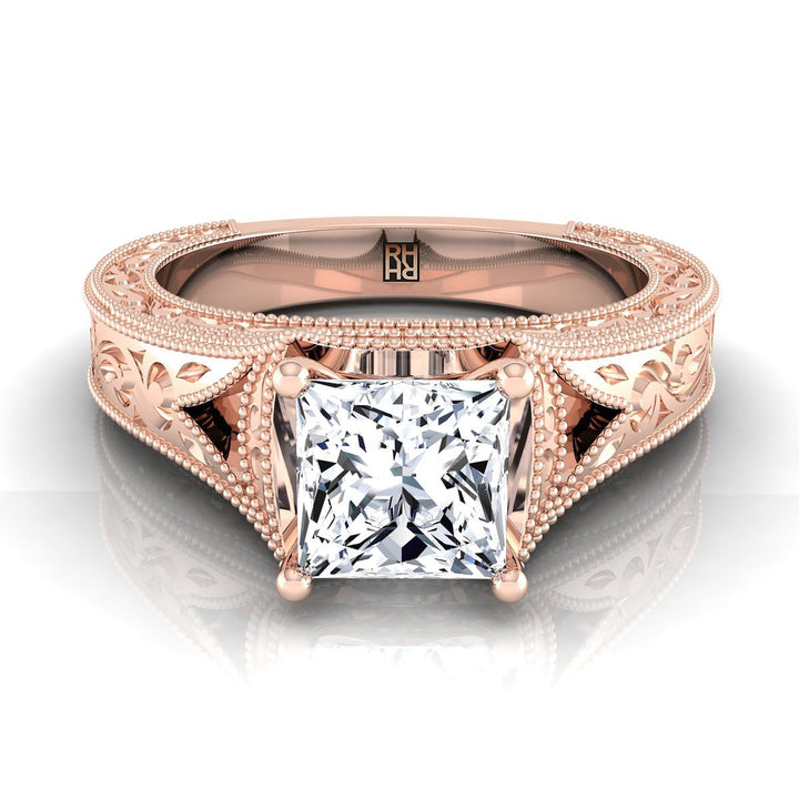 Understated Elegance, This Diamond Princess Cut Engagement Ring In 14k Rose Gold Showcases An Antique Inspired Engraved Design With A Classic Millgrain Finish.
