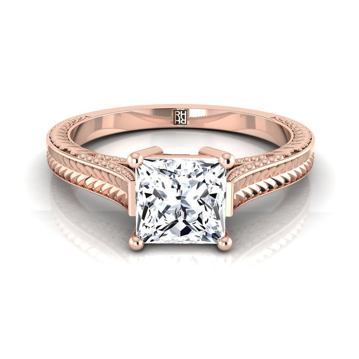 Understated Elegance, This Princess Cut Diamond Engagement Ring Showcases An Antique Inspired Engraved Design With A Classic Millgrain Finish In 14k Rose Gold