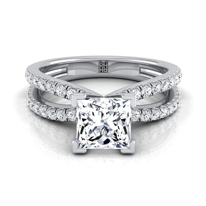 Platinum Princess Cut Diamond Two Row Pavé Split Shank Engagement Ring -1/3ctw