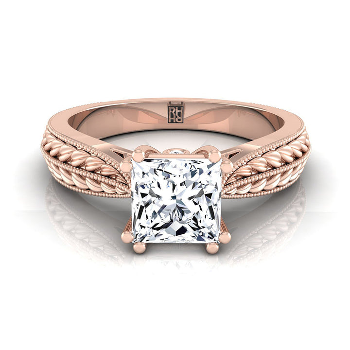 14K Rose Gold Princess Cut Antique Wheat and Bead Pinched Solitaire Engagement RIng
