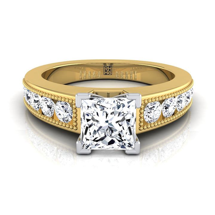 14K Yellow Gold Princess Cut Diamond Antique Milgrain Bead and Channel Set Engagement Ring -1/2ctw