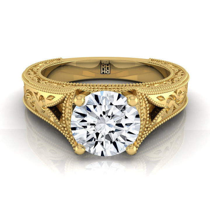 14K Yellow Gold Round Brilliant Hand Engraved and Milgrain Vintage Solitaire Engagement Ring