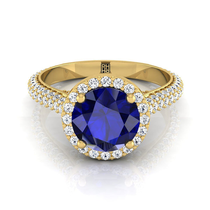 14K Yellow Gold Round Brilliant Sapphire Micro-Pavé Halo With Pave Side Diamond Engagement Ring -7/8ctw