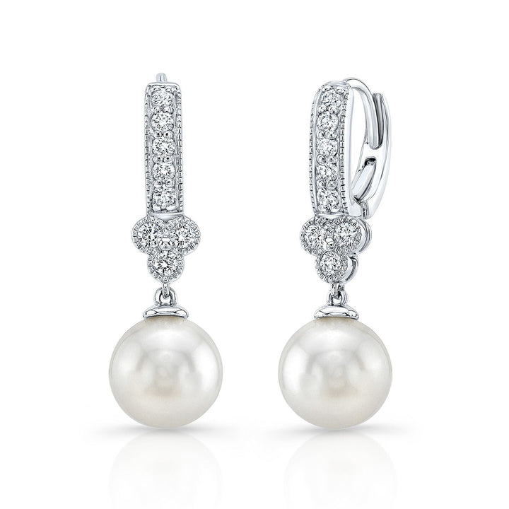 White Pearl And Diamond Dangle Earrings With Clover Top & Miillgrain Detail (8.0-8.5mm) (si)