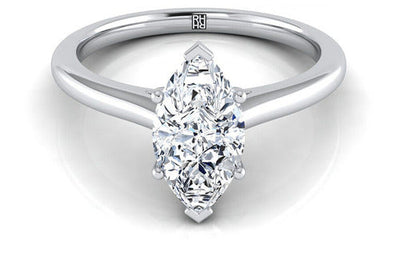 Our customers’ favorite setting for marquise engagement rings is an elegant marquise diamond solitaire with a pave band. If you prefer a classic look, a marquise halo engagement ring has extra diamonds and extra sparkle. Because the marquise cut also lends itself to sleek modern engagement ring styles, a simple bezel-set marquise solitaire engagement ring appeals to many minimalist brides. Three stone marquise engagement rings most often have tapered baguettes on the sides. Looking for something more unique? Try setting a marquise shape diamond east-west across the finger for a twist on a classic. No matter which way you set your marquise make sure those points are protected by the setting. Any prong setting needs v-shaped prongs over the points.