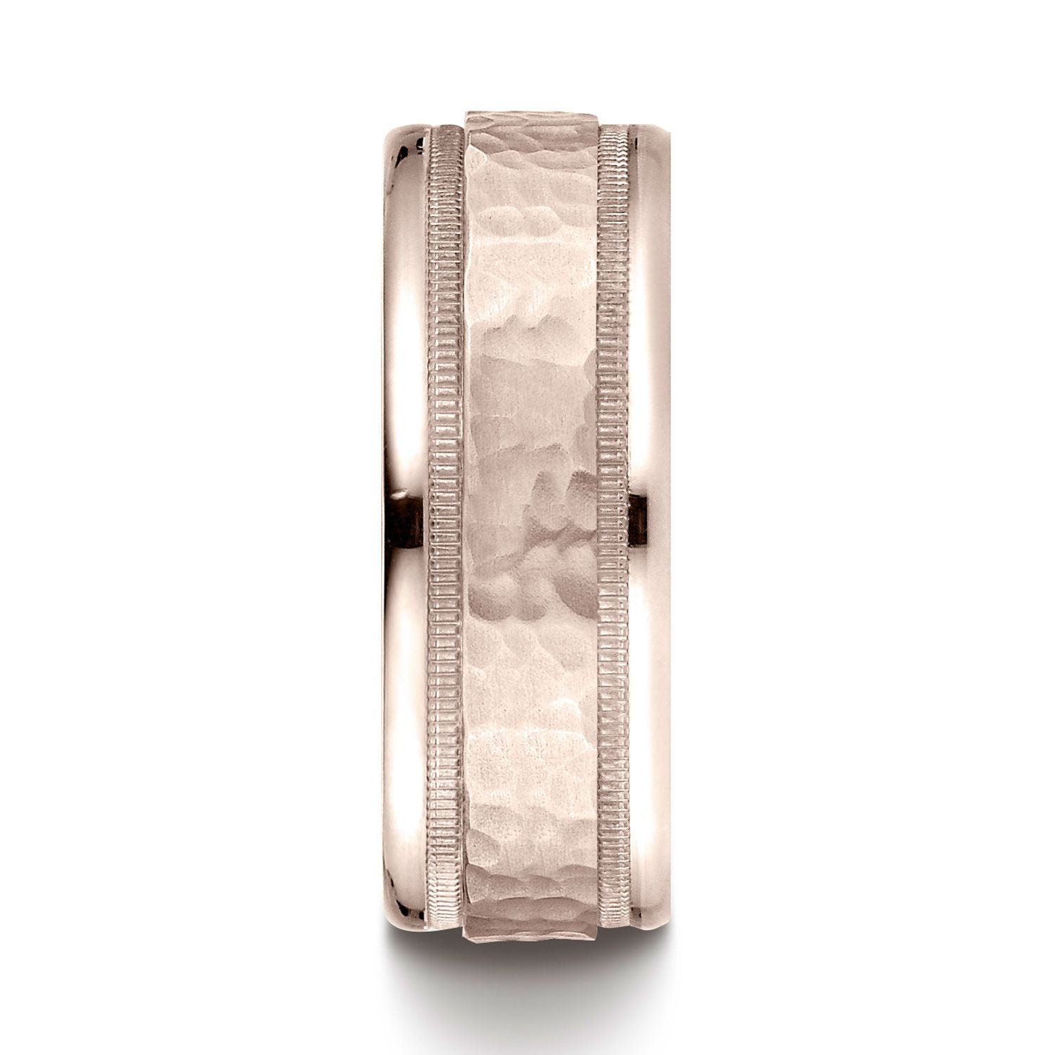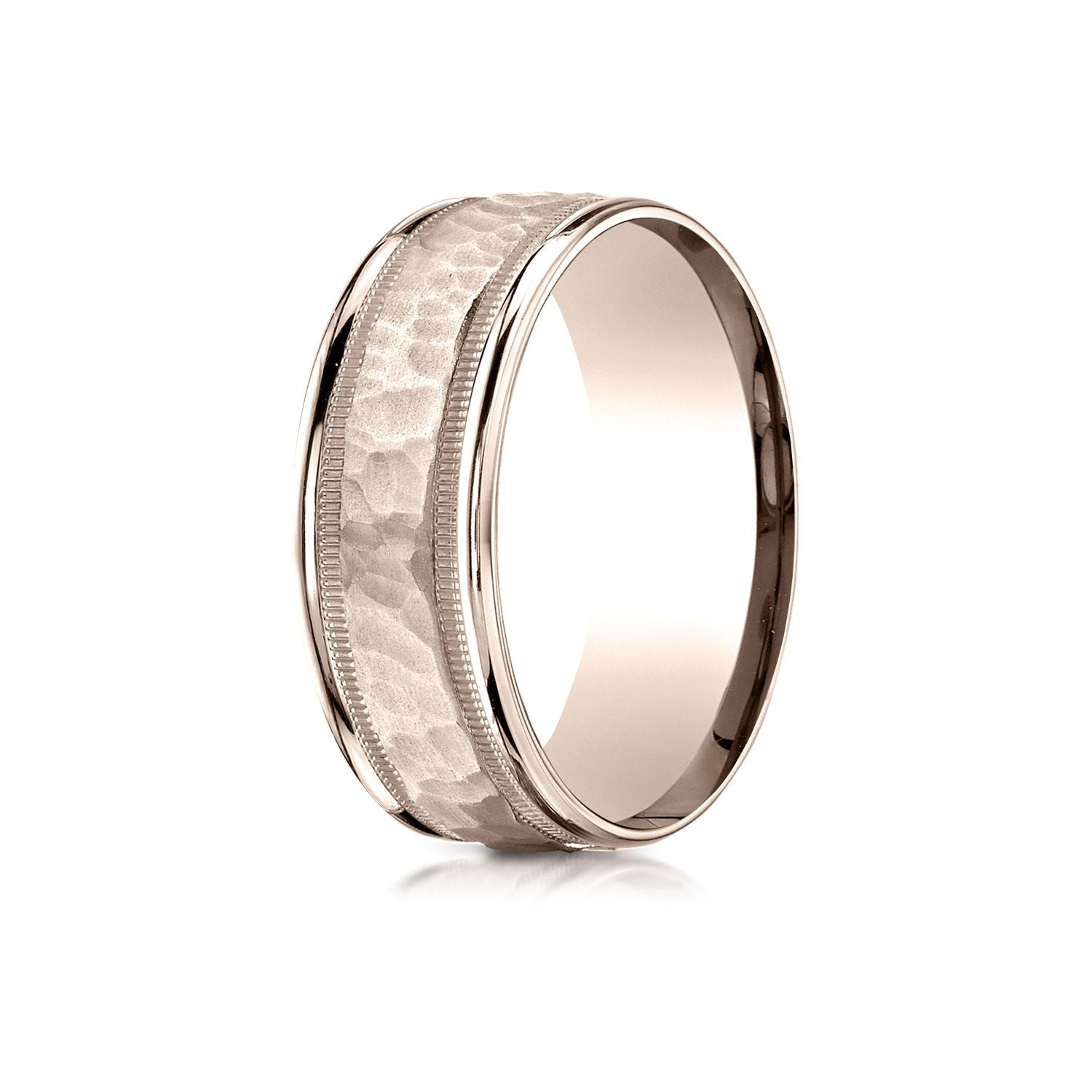 แหวนทองกุหลาบ 14 กะรัต ขนาด 8 มม. แบบสบาย ฟิต แฮมเมอร์เซ็นเตอร์ ขัดเงาสูง ขอบกลม ลวดลายแกะสลัก