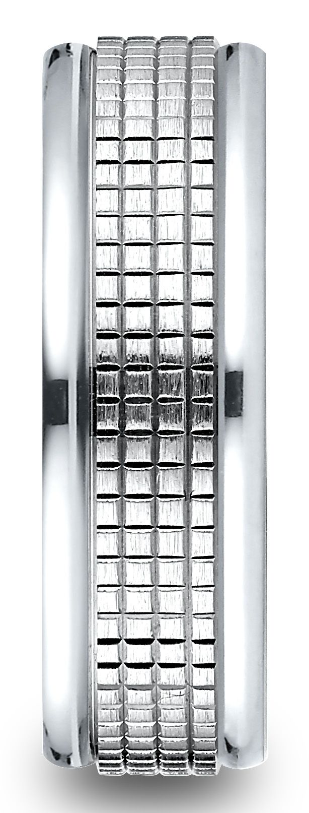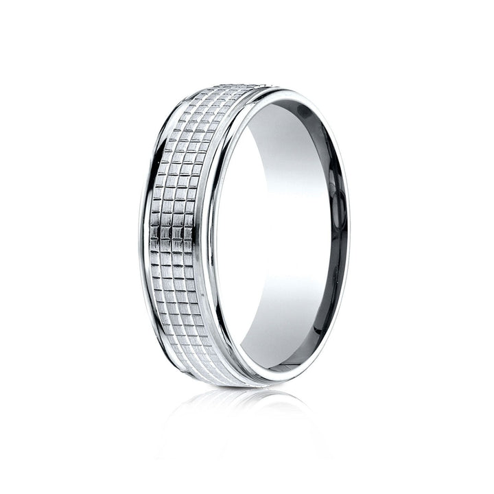 แหวนดีไซน์แกะสลักแบบ Comfort-fit ขนาด 7 มม. ทำจากทองคำขาว 14 กะรัต มีลวดลายตาข่ายที่ซับซ้อนอยู่ตรงกลาง ซึ่งถูกขอบด้วยขอบกลมที่ขัดเงาอย่างสูง