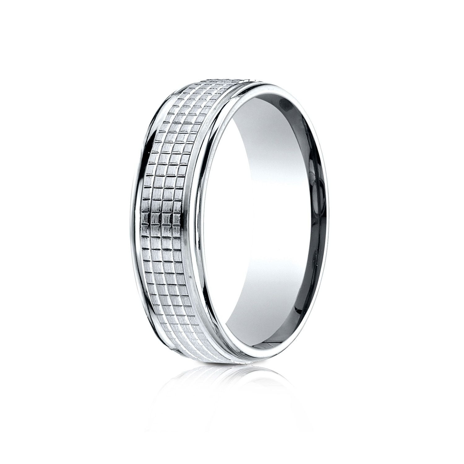 แหวนทองคำขาว 14 กะรัต ขนาด 7 มม. แบบสบาย ฟิตเงา สูง ขอบกลม ลายตารางกลาง
