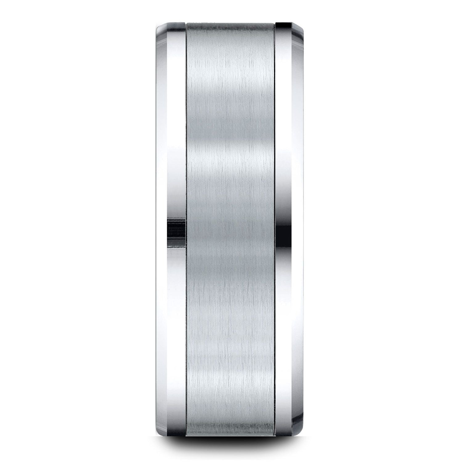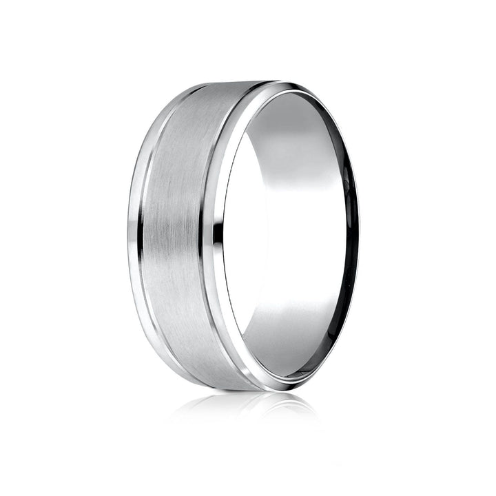 แหวนดีไซน์ 8 มม. ทำจากทองคำขาว 14 กะรัตนี้มีพื้นผิวซาตินที่ถูกกรอบด้วยขอบเงาสูง