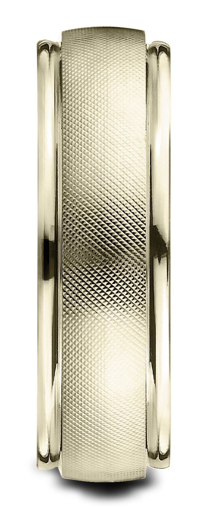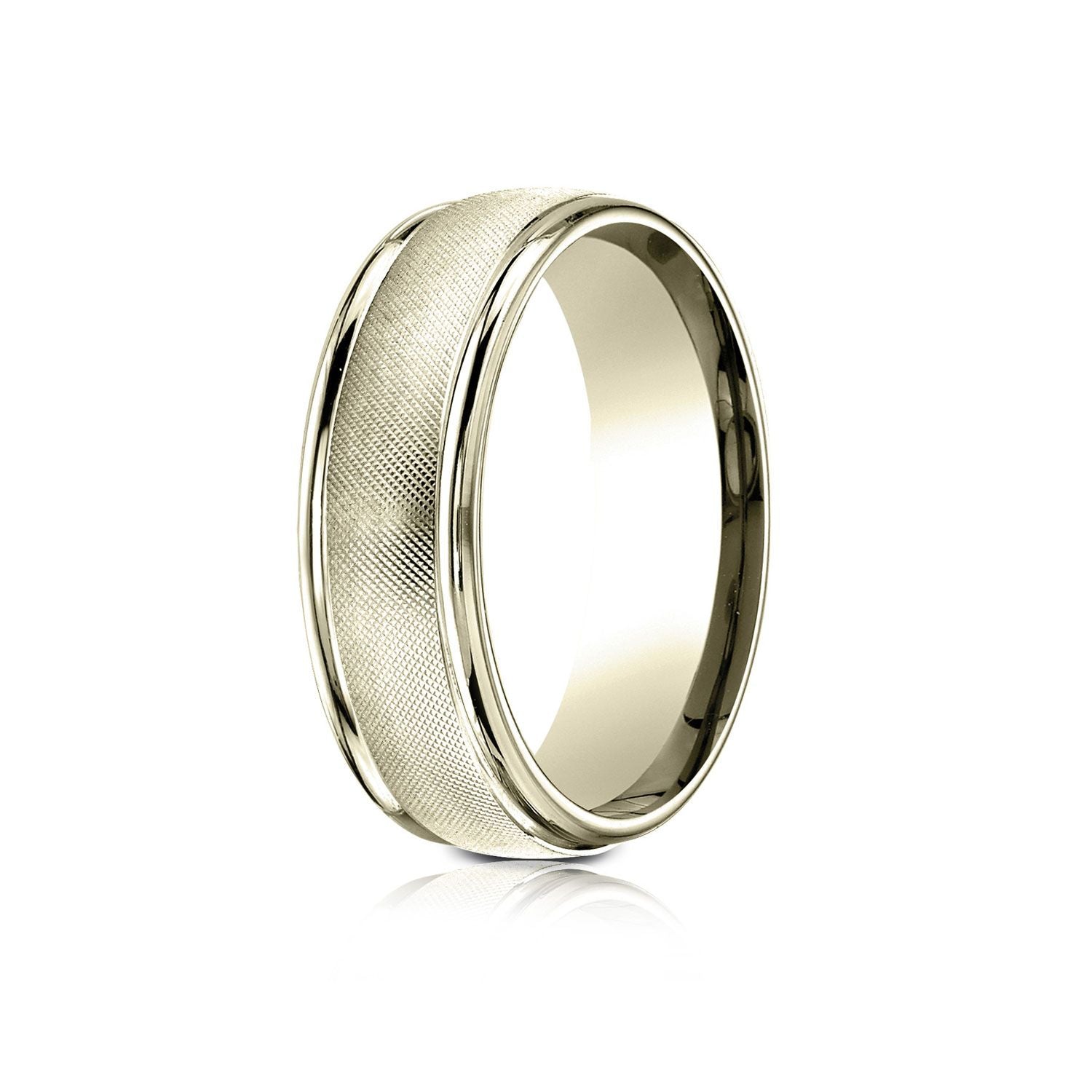 แหวนดีไซน์แกะสลักแบบสบายสวมใส่ ขนาด 7 มม. ทำจากทองคำเหลือง 14 กะรัต มีการตกแต่งผิวฟลอเรนไทน์ที่มีขอบกลมขัดเงา
