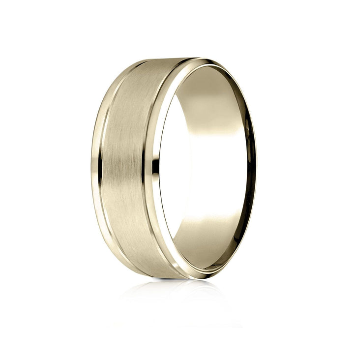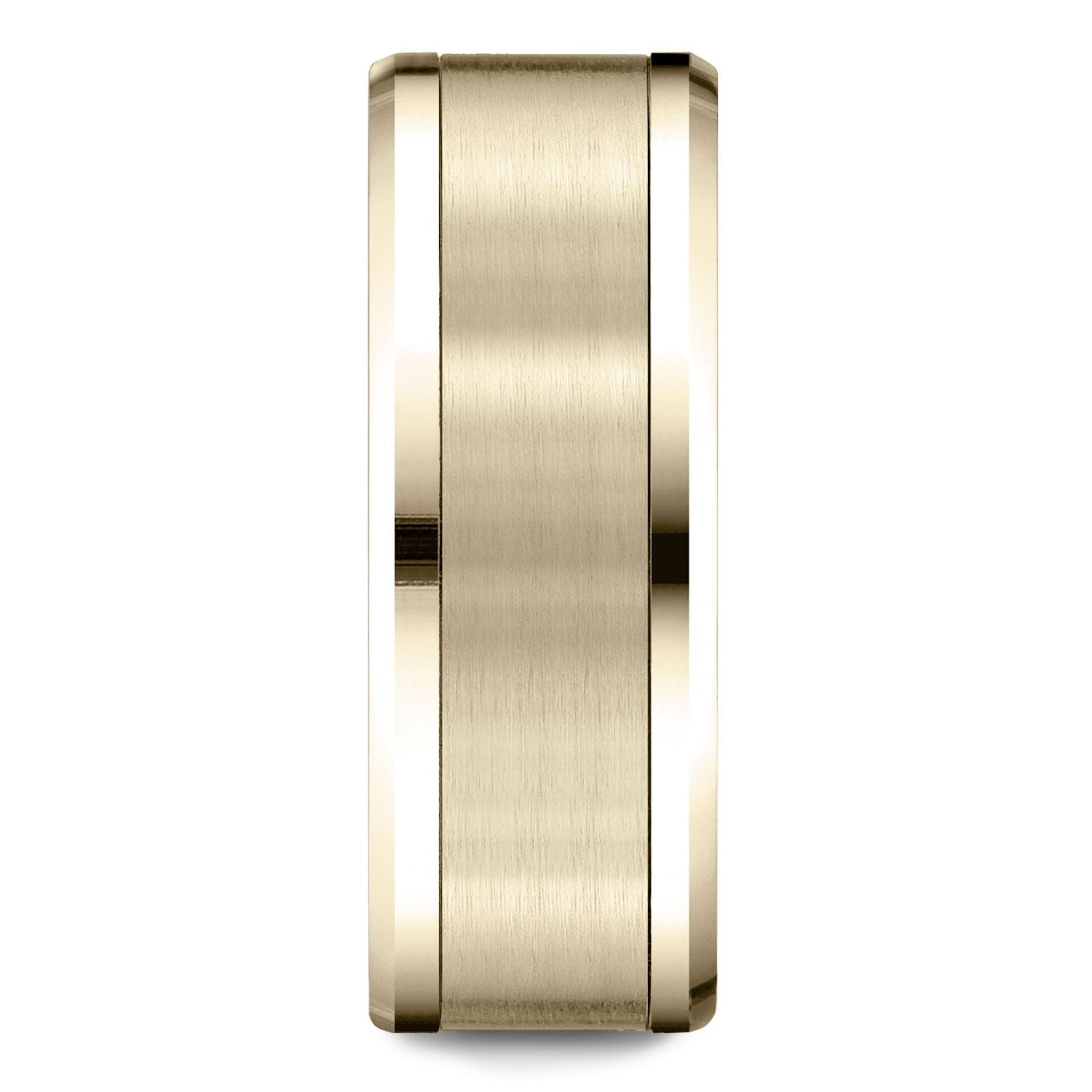 แหวนดีไซน์ 8 มม. สีทองเหลือง 14 กะรัตนี้มีพื้นผิวซาตินที่ถูกกรอบด้วยขอบเงาสูง