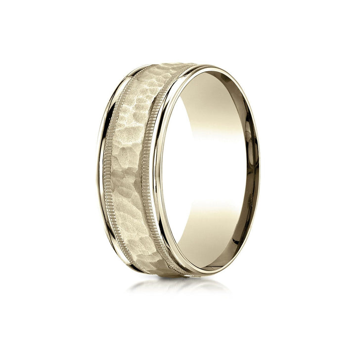 แหวนทองคำ 14 กะรัต สีเหลือง ขนาด 8 มม. แบบสบาย ฟิต แฮมเมอร์ เซ็นเตอร์ ขัดเงาสูง ขอบกลม ลวดลายแกะสลัก