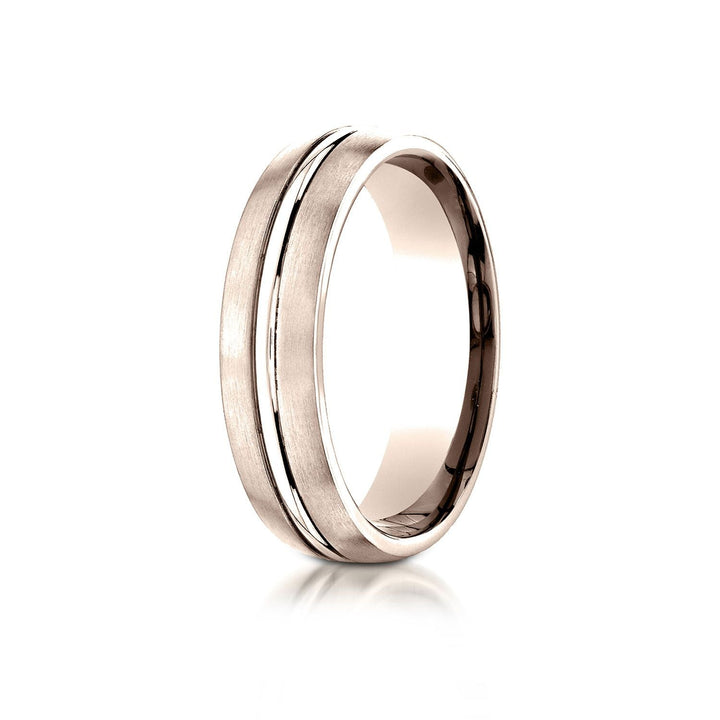 แหวนทองคำชมพู 14k ขนาด 6 มม. แบบสบาย ฟินิชซาตินพร้อมการออกแบบแกะสลักที่มีศูนย์กลางขัดเงา