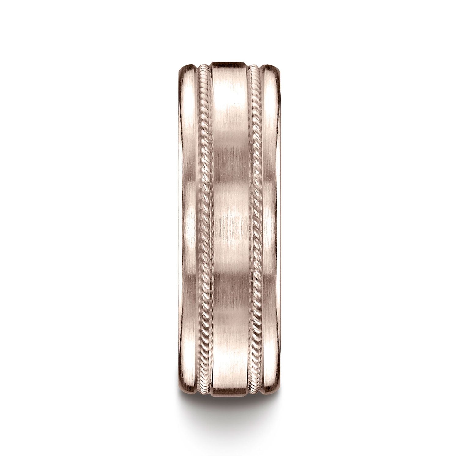 แหวนออกแบบแกะสลักแบบ Comfort-fit ขนาด 7.5 มม. ทำจากทองคำ 14 กะรัต สีโรส มีการตกแต่งแบบซาตินพร้อมการออกแบบเชือกสองแบบที่ไม่อยู่ตรงกลาง เพื่อสร้างลวดลายที่ต่อเนื่องของสไตล์.