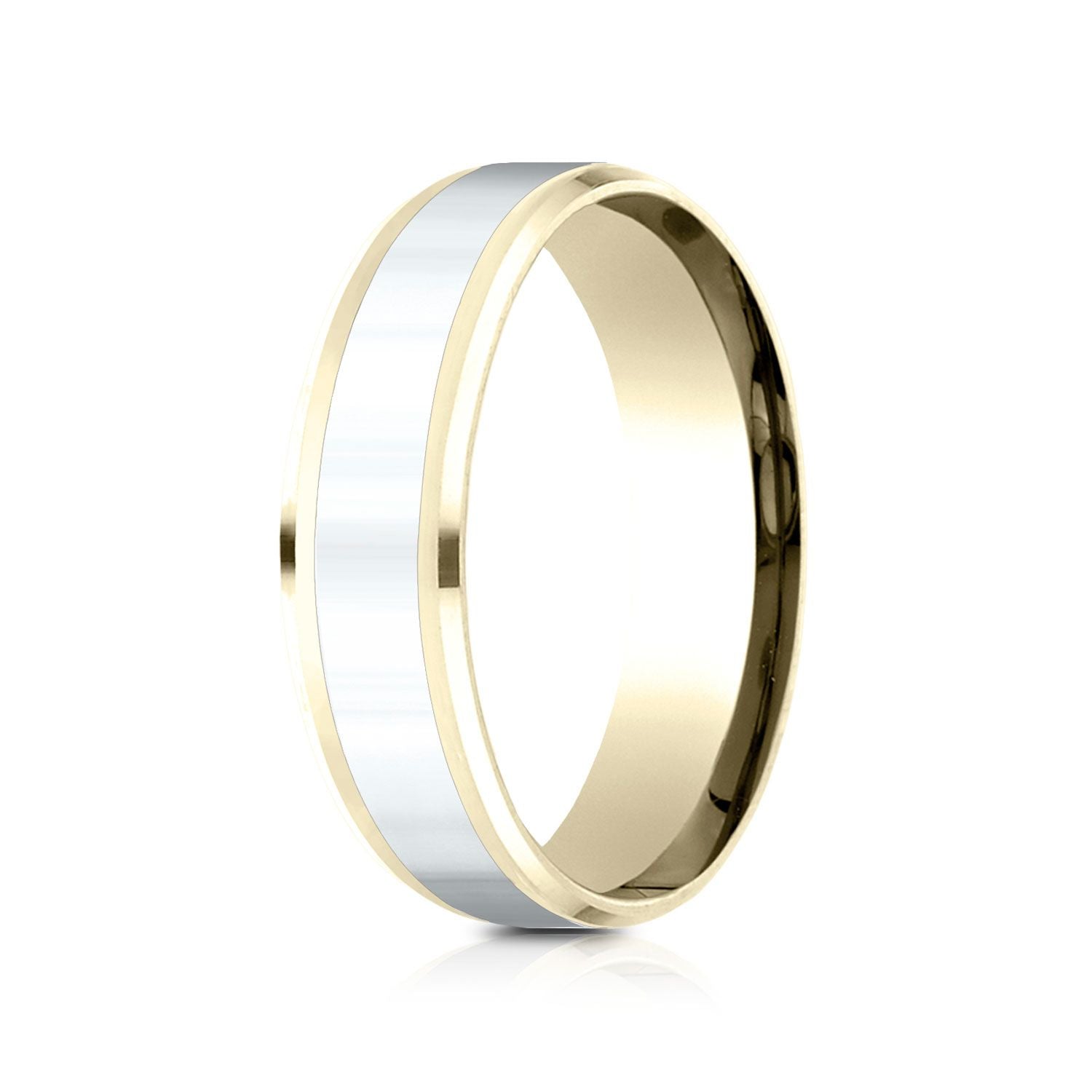 เรียบง่ายอย่างสง่างาม แหวนสองโทน 14 กะรัต ขนาด 6 มม. นี้มีขอบแบบ Drop Bevel และผิวมันเงาสูง
