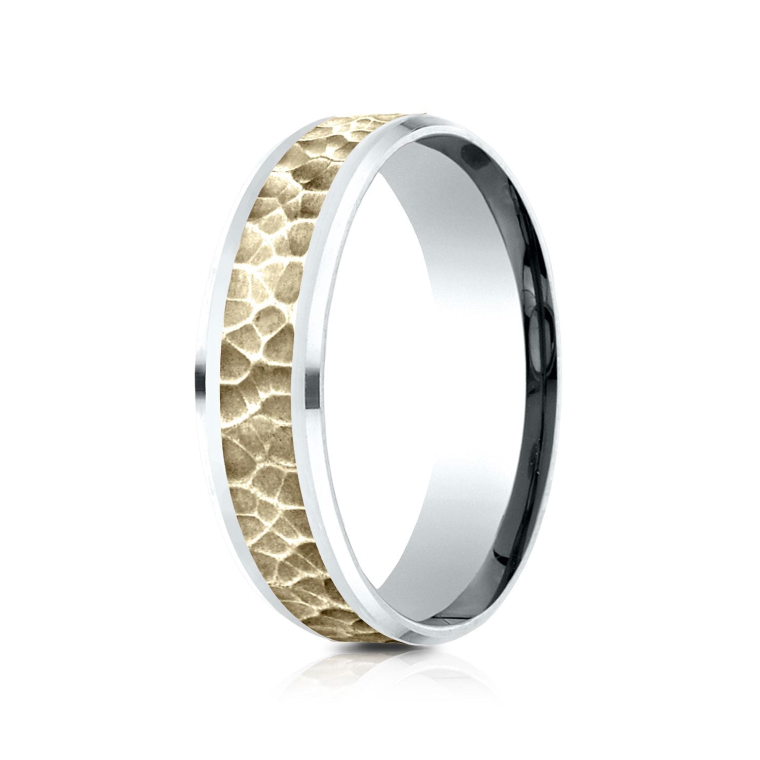 โดดเด่นอย่างมีรสนิยม แหวนดีไซน์สวมใส่สบาย 14 กะรัต สองโทน ขนาด 6 มม. นี้มีพื้นผิวแบบตีมือและขอบเอียงขัดเงาสูง