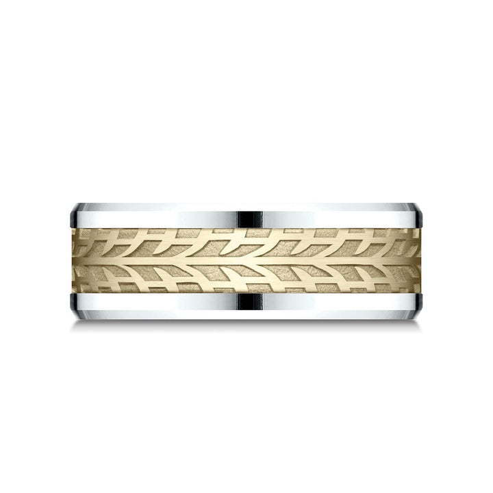 แหวนดีไซน์สวมใส่สบายสองโทนสี 14 กะรัตนี้ถูกเลเซอร์ด้วยลวดลายร่องที่ไม่เหมือนใครเพื่อรูปลักษณ์ของความเป็นเอกลักษณ์ที่หรูหรา