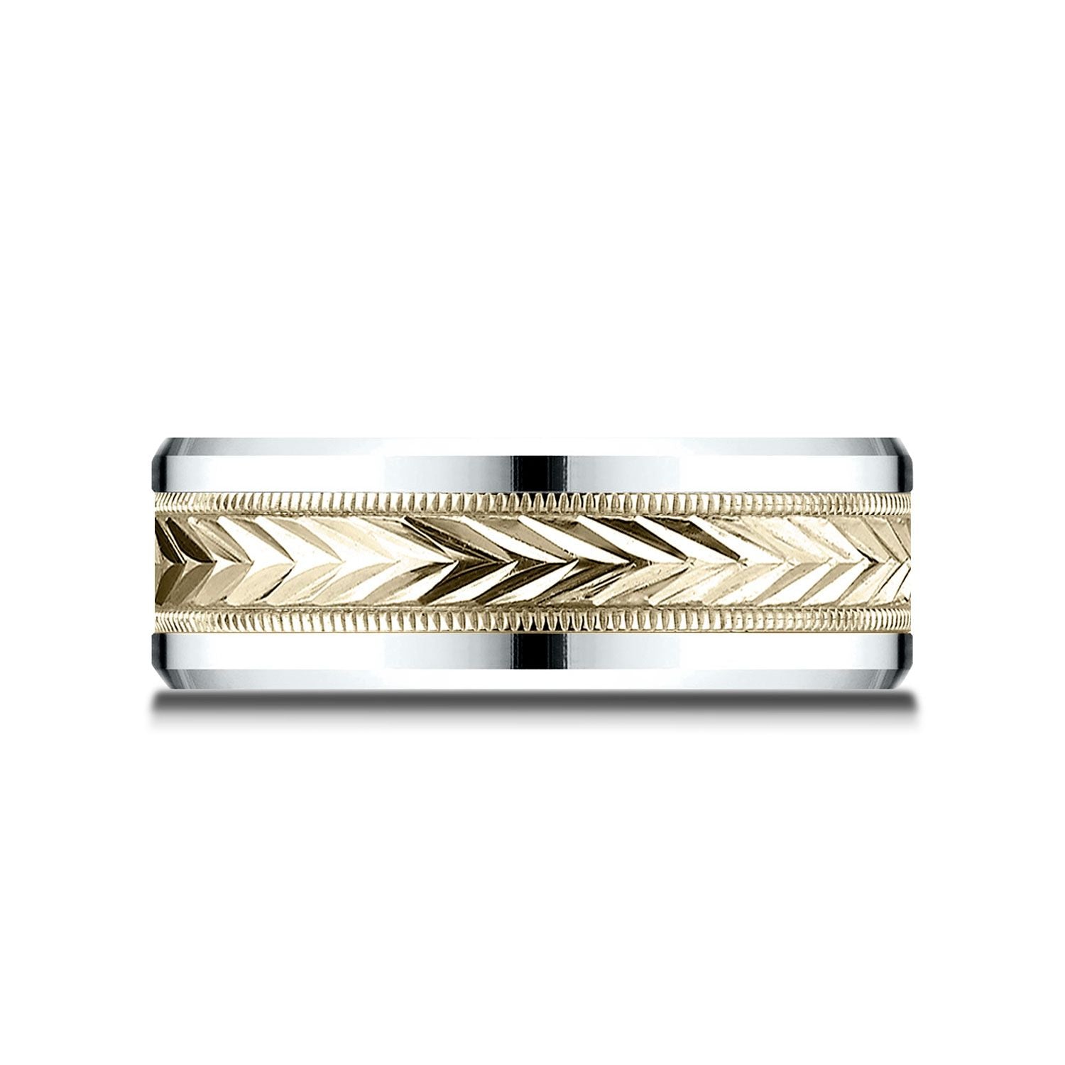 แหวนสวมใส่สบายขนาด 8 มม. สองโทนสี 14 กะรัตนี้มีลวดลายข้าวสาลีแบบออร์แกนิกที่ล้อมรอบด้วยขอบเอียงขัดเงาสูง