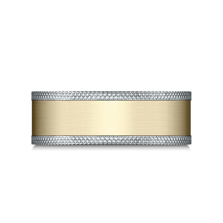 แหวนวงนี้ทำจากทอง 14 กะรัต สองโทน ขนาด 8 มม. แบบสวมใส่สบาย มีผิวด้านตรงกลางที่โดดเด่นด้วยขอบลายสลักที่ซับซ้อนเป็นเอกลักษณ์