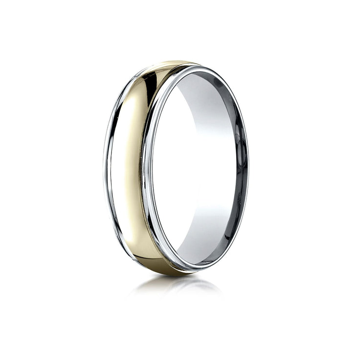 แหวนดีไซน์แกะสลักแบบสองโทนสีทอง 14 กะรัต ขนาด 6 มม. แบบสวมใส่สบายนี้ มีส่วนกลางเป็นทองเหลือง 14 กะรัตขัดเงาสูง และขอบเป็นทองขาว 14 กะรัตขัดเงาสูง