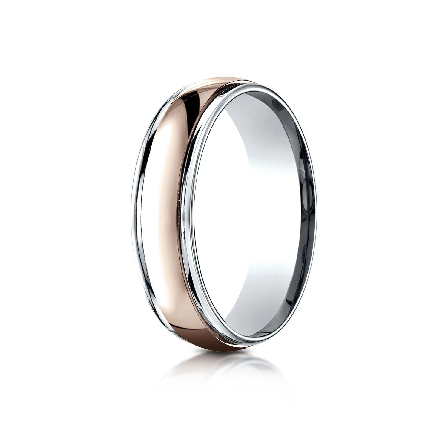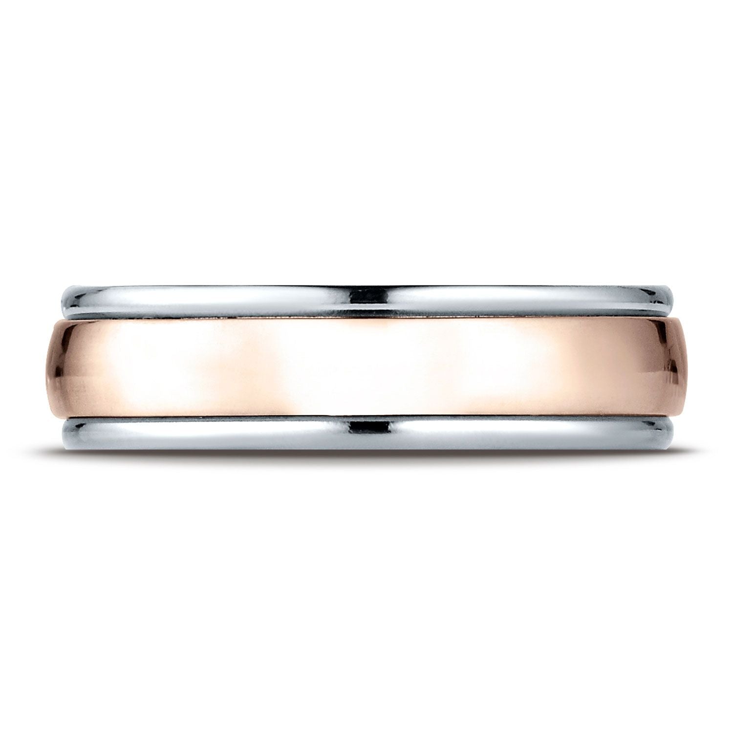 แหวนดีไซน์แกะสลักขัดเงาสูงแบบสองโทนสีทอง 14 กะรัต ขนาด 6 มม. ที่มีความสบายในการสวมใส่ มีทองกุหลาบ 14 กะรัตตรงกลางและทองขาว 14 กะรัตตามขอบ เพื่อรูปลักษณ์ที่ทั้งเรียบหรูและละเอียดอ่อน