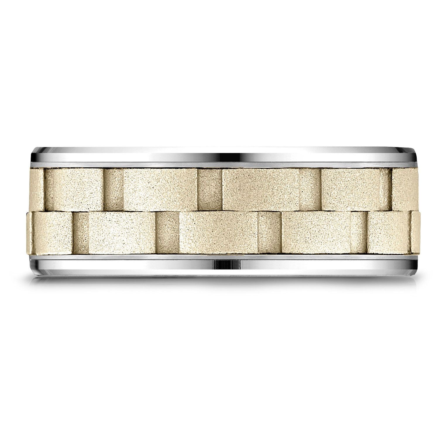 แหวนดีไซน์สองโทนสีทอง 14 กะรัต ขนาด 8 มม. ที่ไร้กาลเวลาชิ้นนี้ มีการตกแต่งผิวด้านแบบแซนด์บลาสต์ด้วยทองเหลืองเฉพาะตัวของเรา บนดีไซน์โซ่เชื่อม และขอบขัดเงาสูงด้วยทองคำขาว