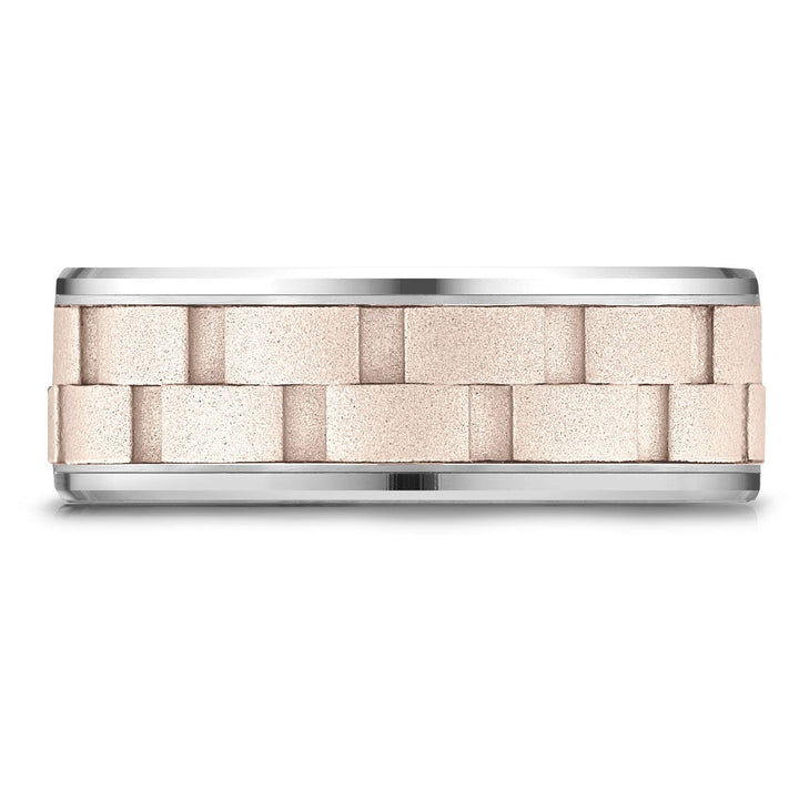 แหวนดีไซน์สองโทนสีทอง 14 กะรัต ขนาด 8 มม. ที่ไร้กาลเวลาชิ้นนี้ มีการตกแต่งผิวด้านแบบซาตินด้วยเทคนิคทรายเปลือกกุหลาบเฉพาะตัวของเรา บนดีไซน์โซ่เชื่อม และขอบขัดเงาสีทองขาว