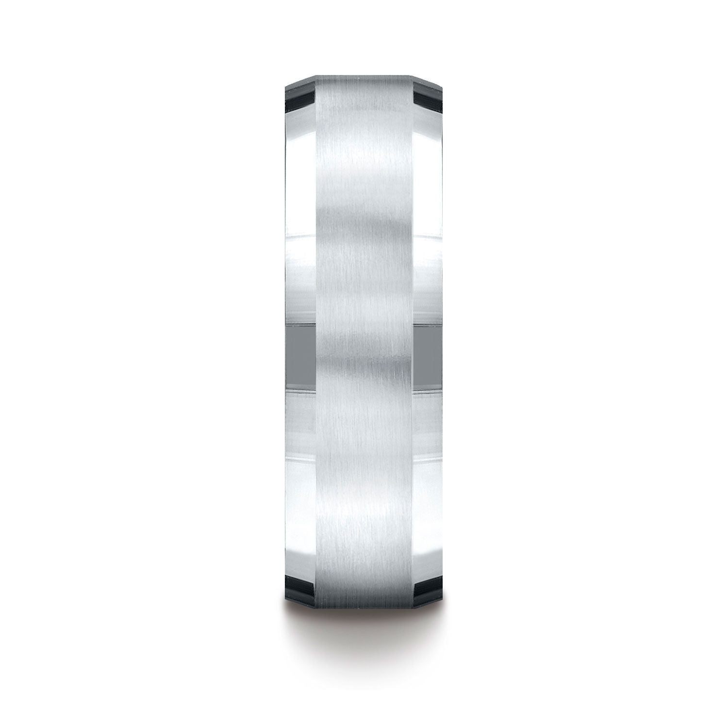แหวนวงสี่ด้านขนาด 7 มม. ที่สวมใส่สบาย ผลิตจากทองคำขาว 14 กะรัตที่น่าทึ่งนี้ มีส่วนกลางที่ตกแต่งด้วยผิวด้าน และขอบเอียงที่ขัดเงาสูง