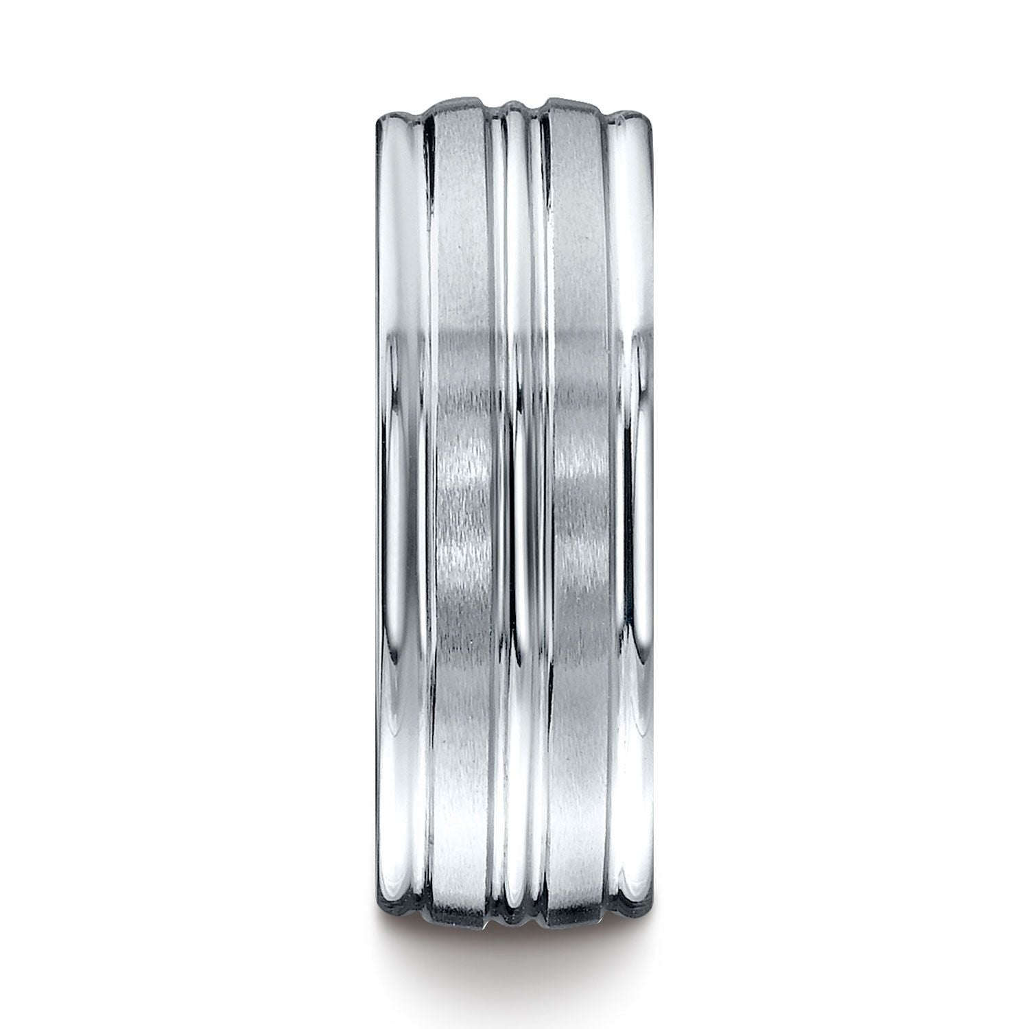 แหวนดีไซน์แกะสลักสีขาว 14 กะรัต ขนาด 8 มม. แบบสวมใส่สบาย ผิวด้านซาติน มีขอบกลมขัดเงาสูงและแถบตรงกลางที่ให้ความสม่ำเสมออย่างละเอียดอ่อนในสไตล์และรูปทรง