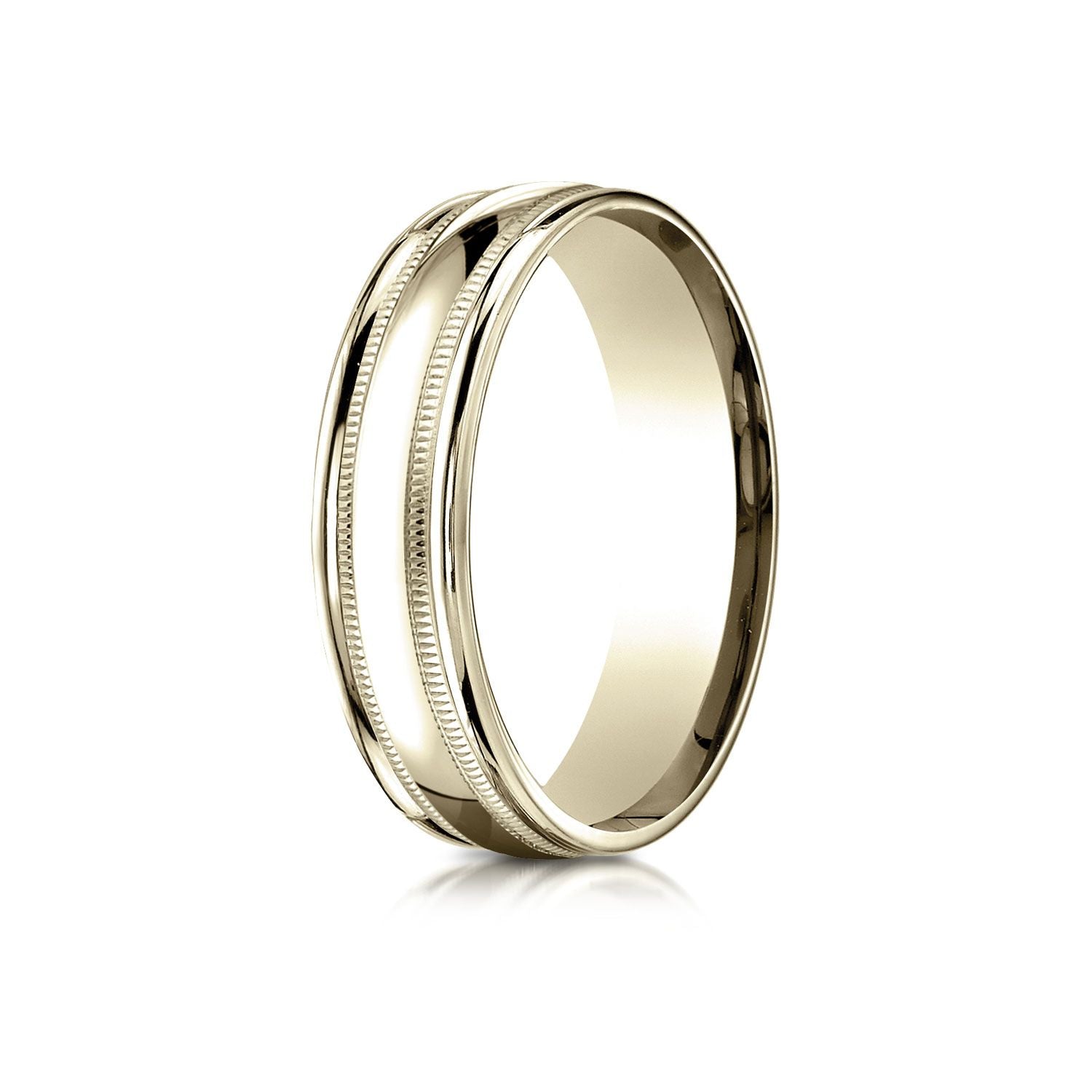 แหวนวงนี้ทำจากทองคำ 14 กะรัต สีเหลือง ขนาด 6 มม. แบบสวมใส่สบาย มีลวดลายแกะสลัก พร้อมการขัดเงาสูงและขอบกลมที่มีลายมิลเกรน