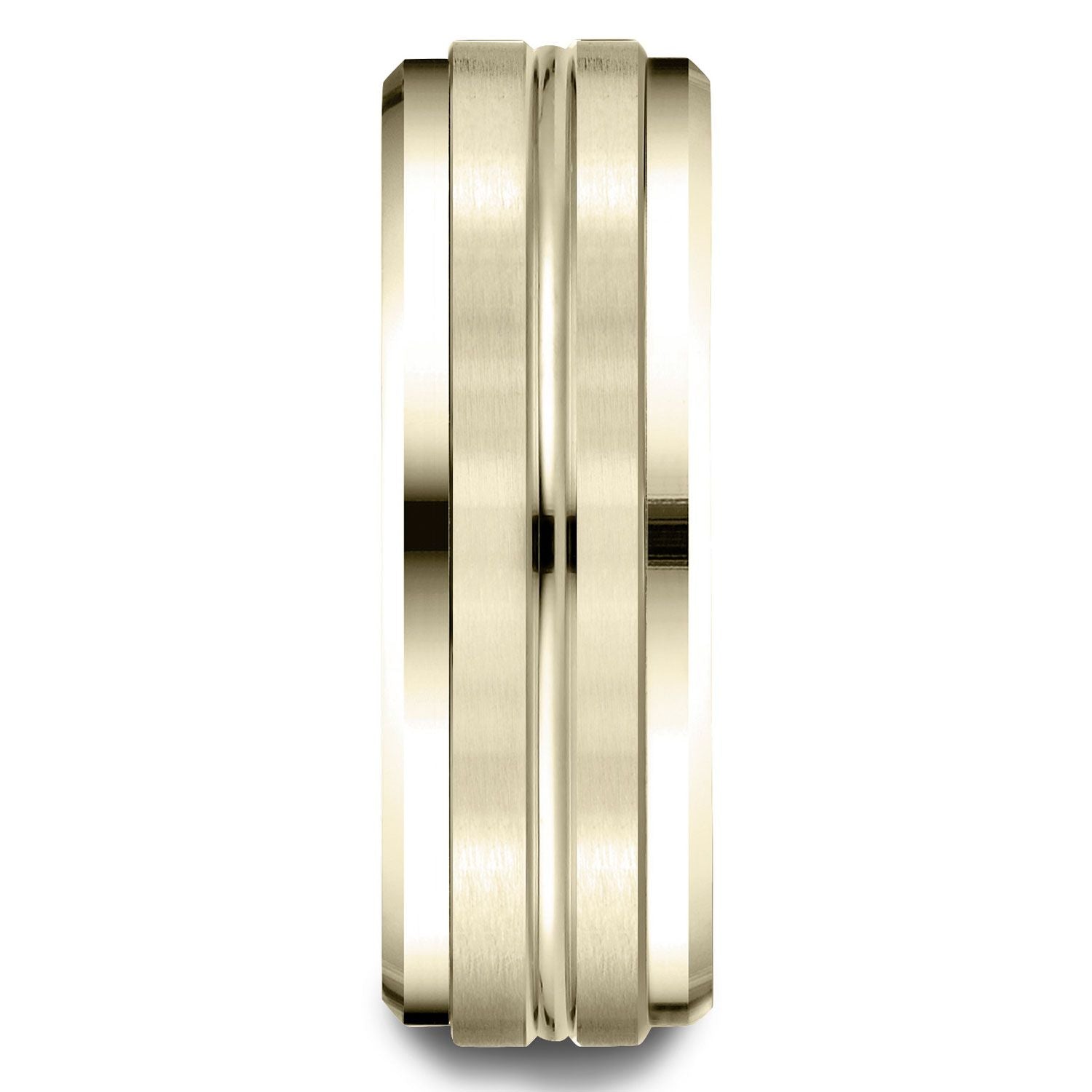 แหวนดีไซน์แกะสลักแบบสวมใส่สบาย ขนาด 8 มม. ทำจากทองคำเหลือง 14 กะรัต หนึ่งเดียวในแบบของมัน มาพร้อมกับขอบเอียงแบบหยดน้ำ ผิวด้านซาตินหรูหราที่ตรงกลาง และร่องกลางที่ขัดเงาสูง