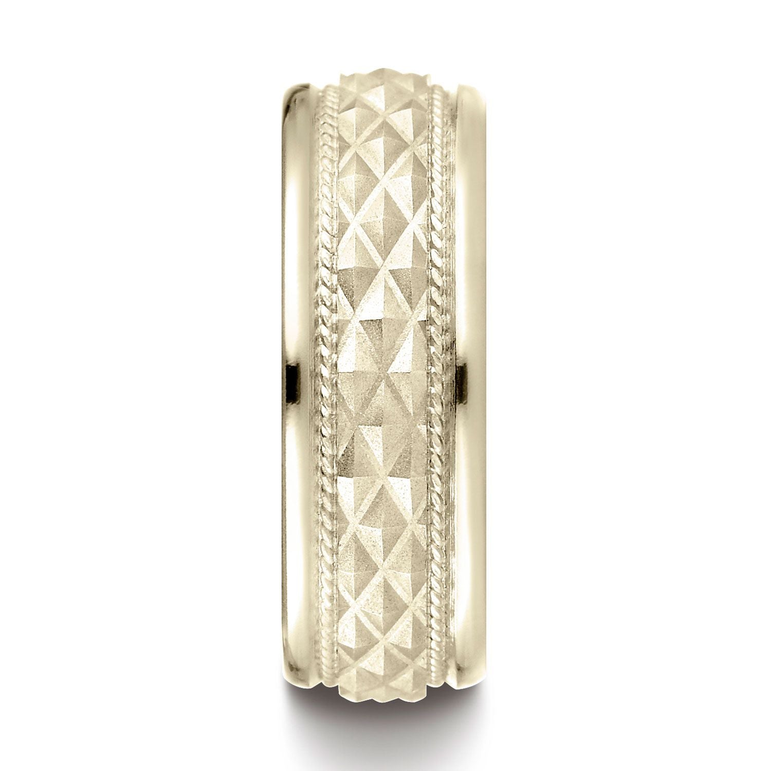แหวนวงนี้ทำจากทองคำ 14 กะรัต สีเหลือง ขนาด 8 มม. แบบสวมใส่สบาย มีลวดลายตารางไขว้ที่ซับซ้อน อยู่ระหว่างลวดลายเชือก และขอบกลมขัดเงาสูง